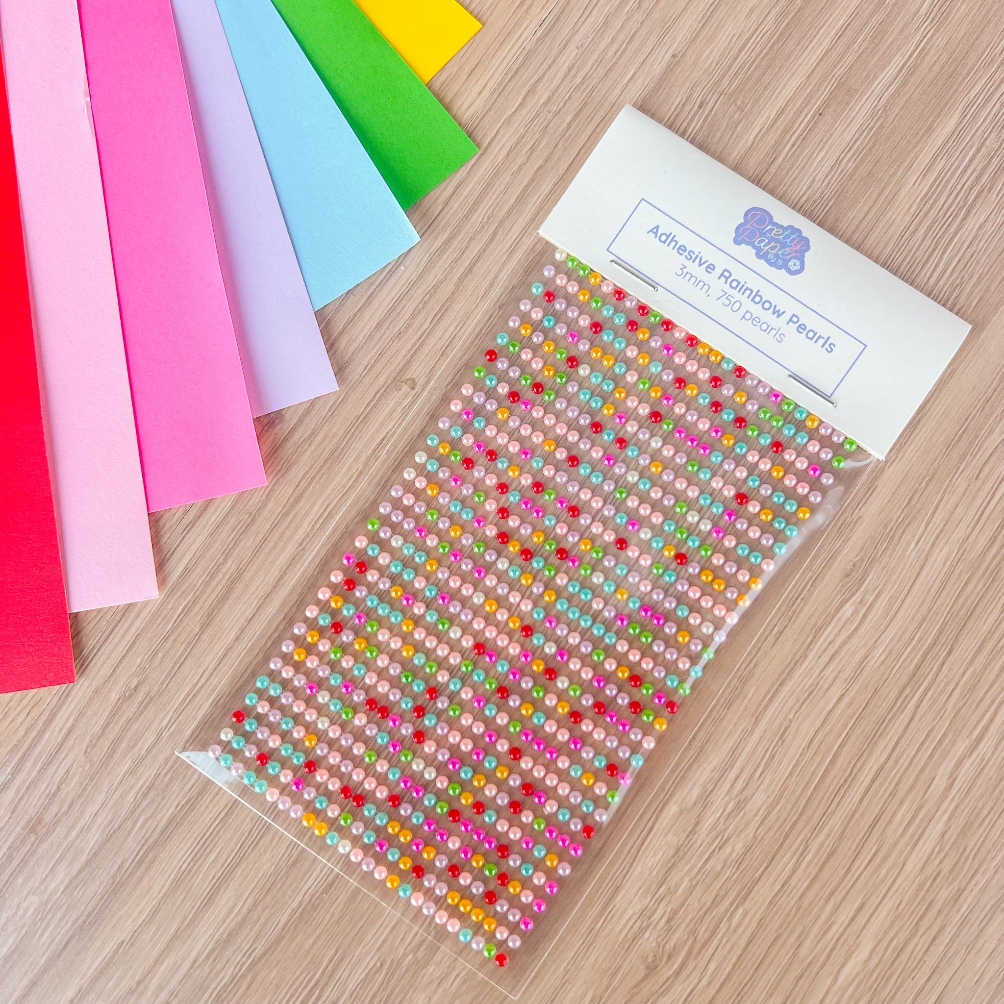 A pack contains 750 multi-coloured, round, self-adhesive pearls each measuring 3mm in diameter.