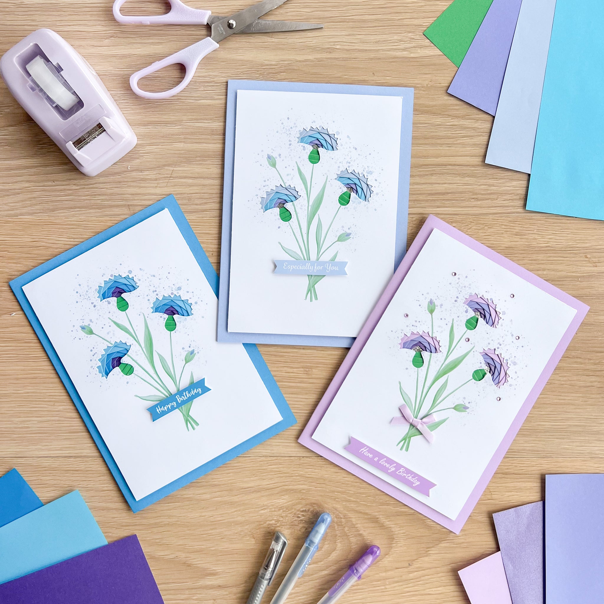 To make your own iris folding Cornflower greeting cards, you will also need: iris folding paper, sticky tape, sticky foam pads, scissors & a little blue or white tack. Happy crafting!