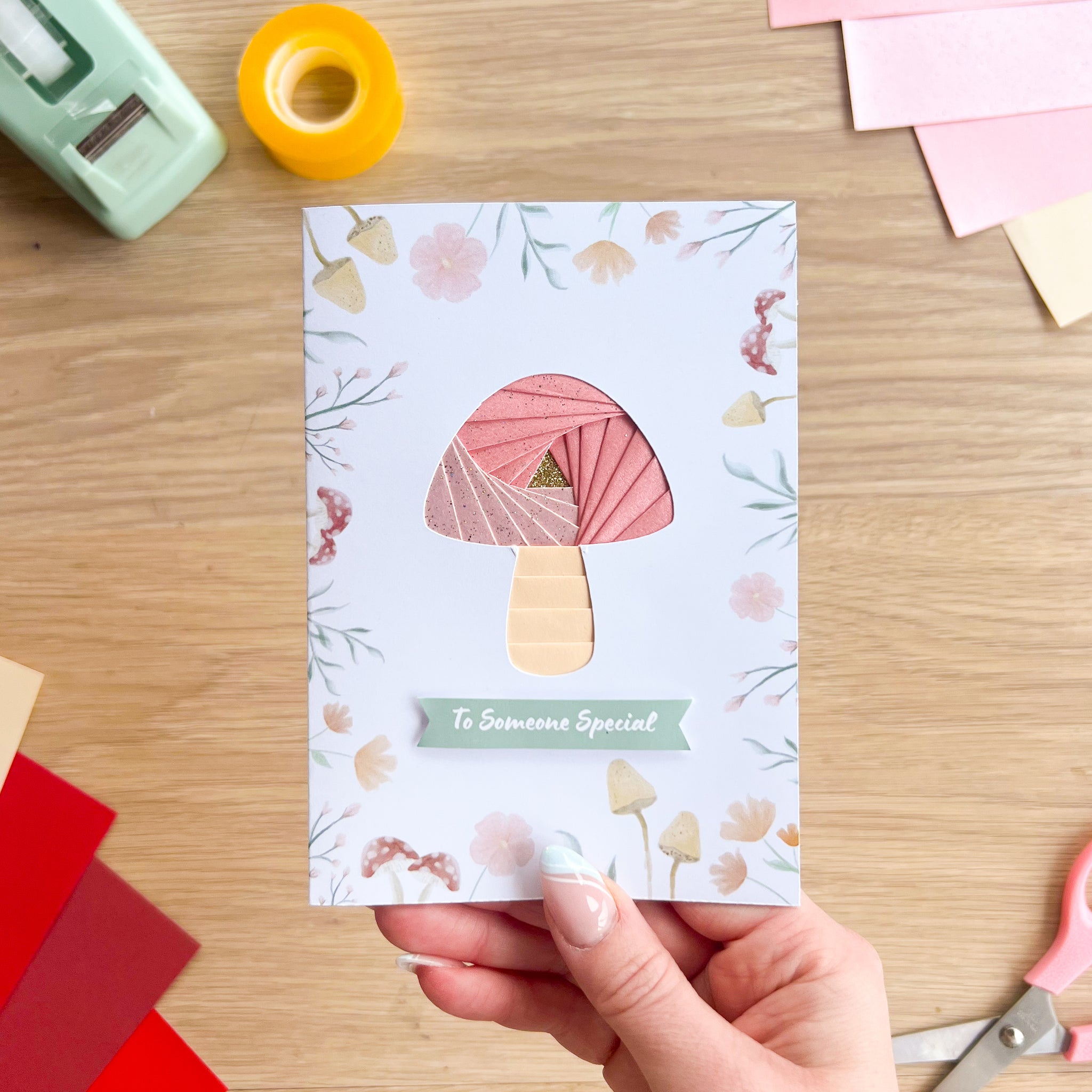 To make your own iris folding toadstool cards, you will also need: iris folding paper, sticky tape, double-sided tape, scissors & white tack. Happy crafting!