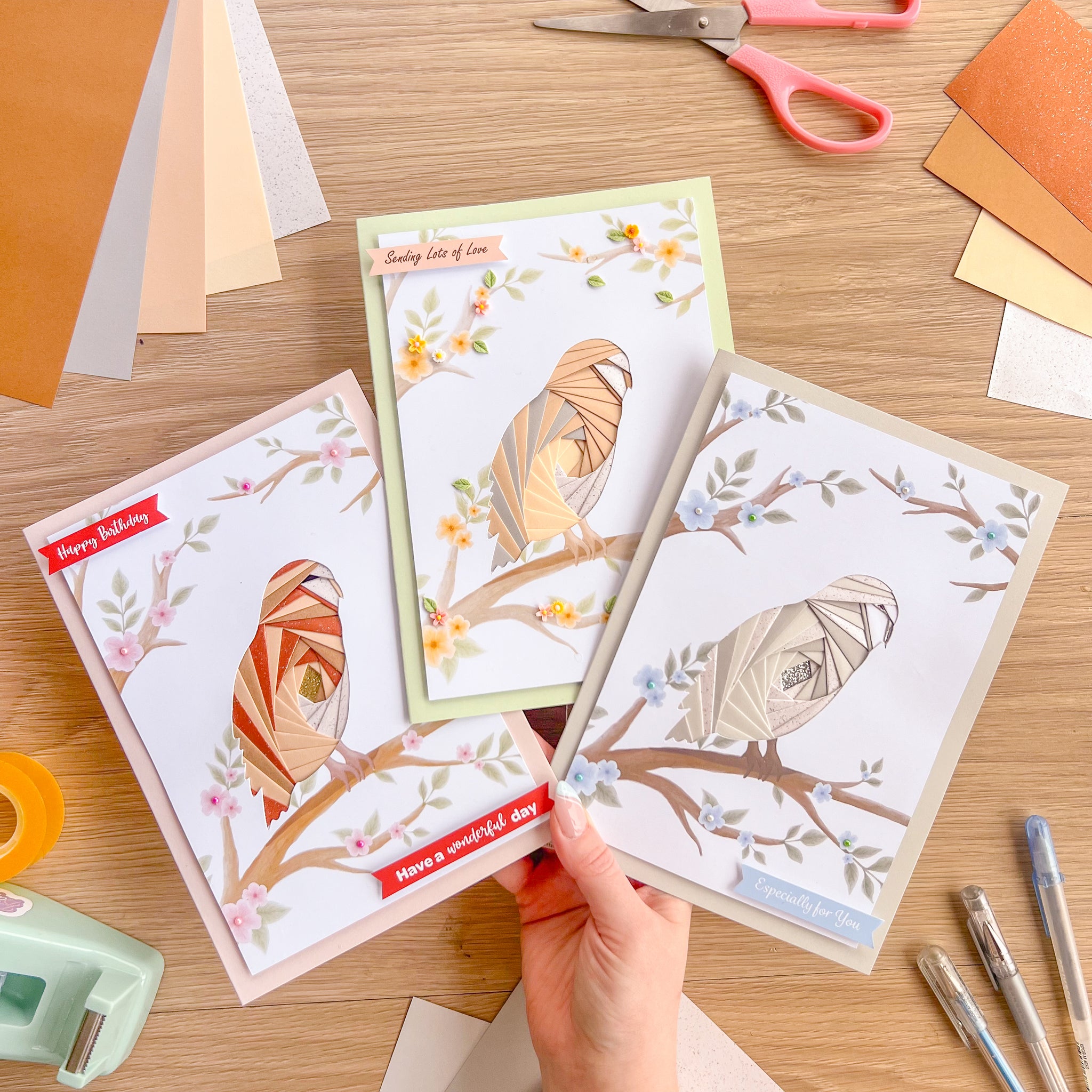 To make your own iris folding Owl greeting cards, you will also need: iris folding paper, sticky tape, sticky foam pads, scissors & a little blue or white tack. Happy crafting!